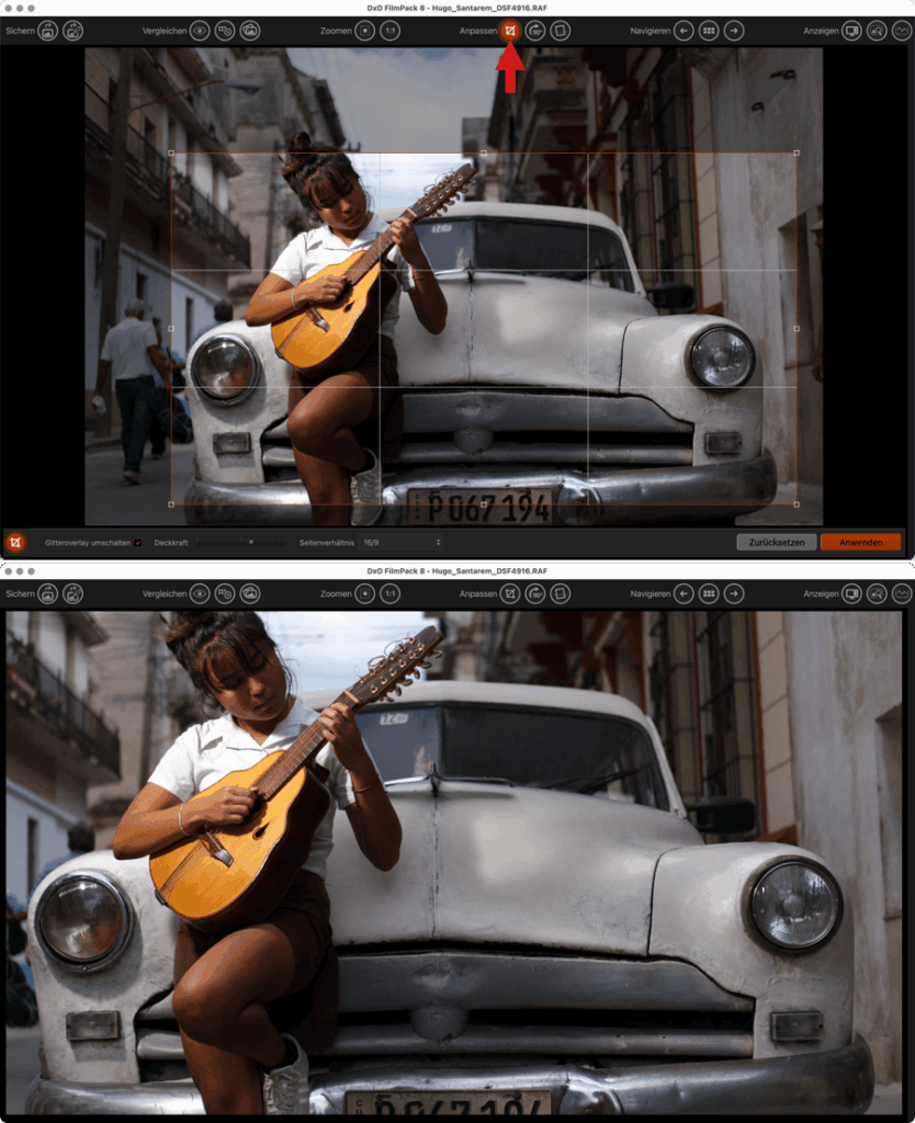 - Nachdem Sie Ihr Bild in DxO FilmPack geöffnet haben, klicken Sie in der oberen Werkzeugleiste auf die Schaltfläche Zuschneiden. Ein anpassbares Gitteroverlag erscheint auf Ihrem Bild.