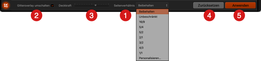 - Seitenverhältnis: Dieses Dropdown-Menü gibt Ihnen die Auswhal zwischen einigen vordefinierten Bildseitenverhältnissen, benutzerdefinierten Einstellungen oder den Originalproportionen des Bildes (Bildseitenverhältnis beibehalten).