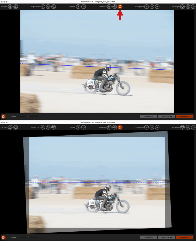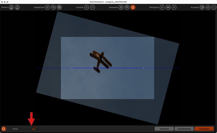 - Wenn Sie mit der Begradigung Ihres Bildes zufrieden sind, klicken Sie in der unteren Leiste rechts auf Anwenden. Das Geraderichten des Horizonts zieht einen Bildbeschnitt nach sich (die beschnittenen Bildbereiche werden durch eine durchsichtige, graue Maske gekennzeichnet). Ihre vorgenommene Horizontkorrektur können Sie durch Klick auf Zurücksetzen jederzeit wieder rückgängig machen.