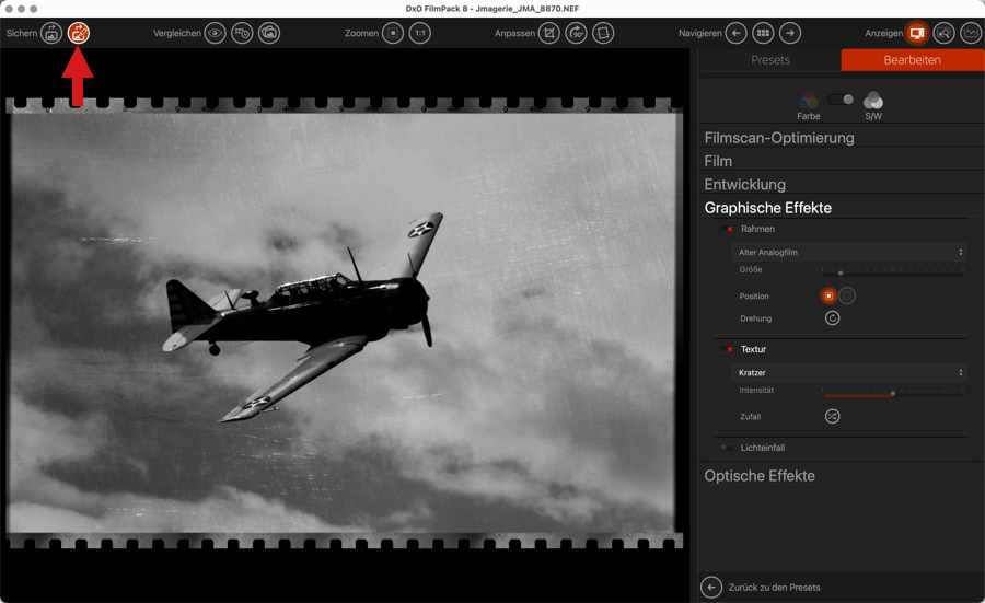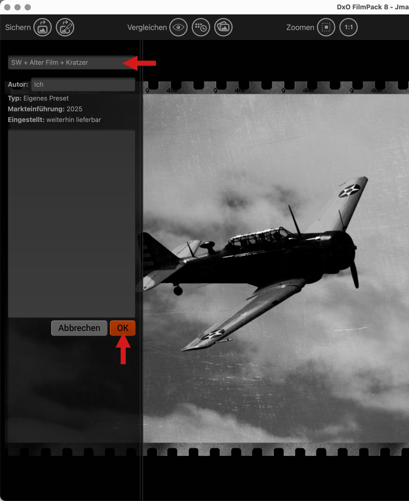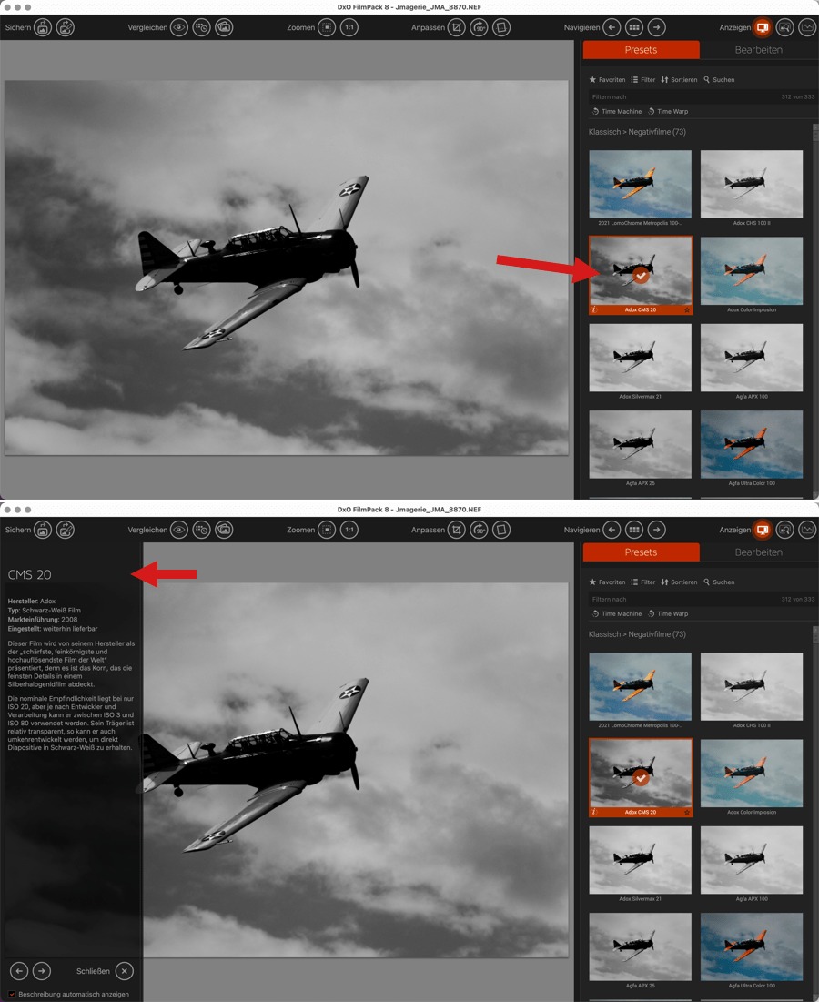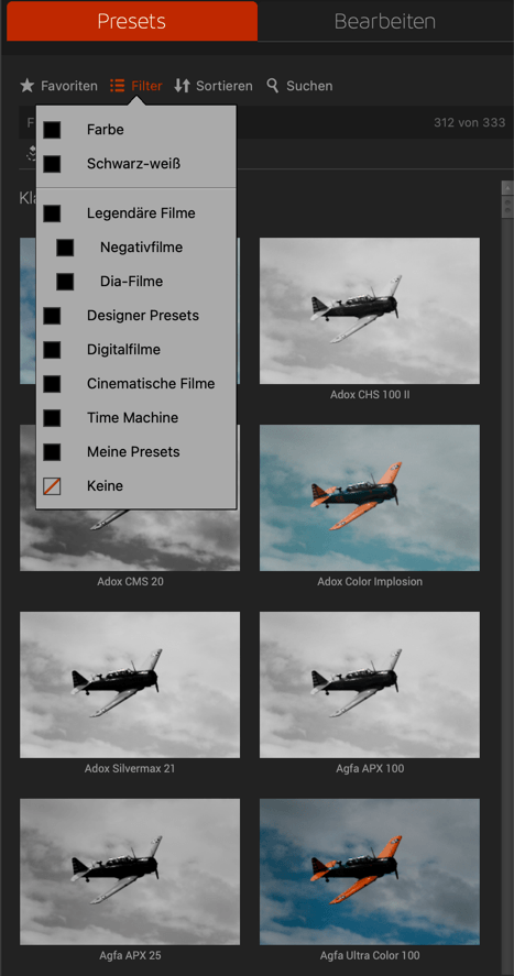 - Presetname: Der Name hängt vom Preset-Typ ab, es kann ein bestimmtes Rendering (Cappuccino) oder auch ein Film (Kodak T-Max 100) sein.