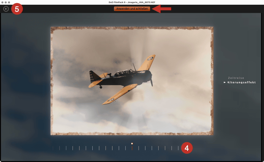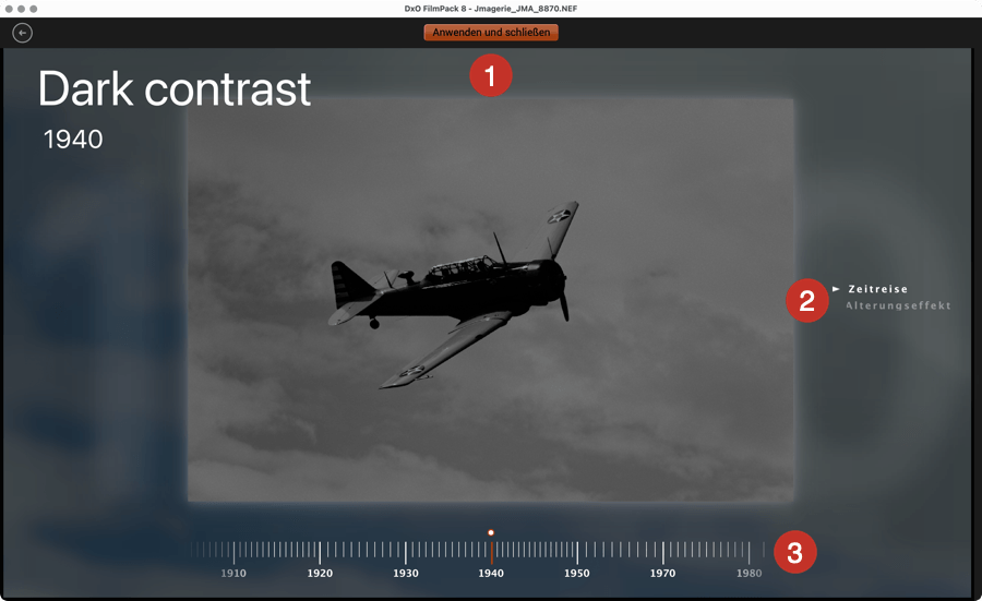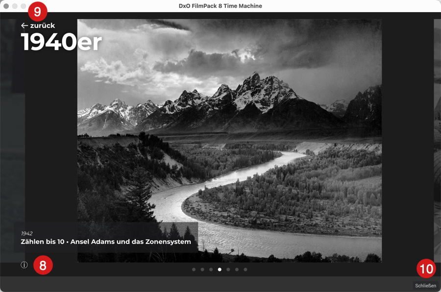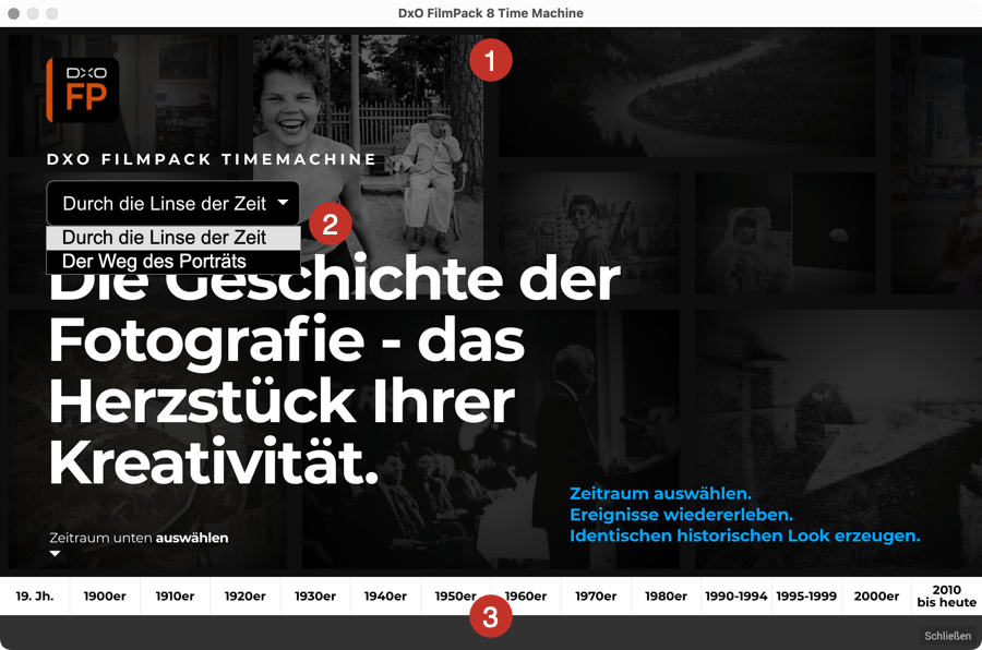 Die Time Machine-Funktion ermöglicht es Ihnen, analoge Film-Presets in einen historischen Kontext zu setzen, macht Spaß und bietet ein noch umfangreicheres Bildbearbeitungserlebnis. Klicken Sie dazu auf Time Machine in der Kopfzeile des Bedienfelds der Preset-Palette.