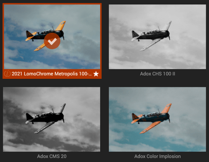 - Jedes Beispiel wird von Presets begleitet, die Sie auf das derzeit in DxO FilmPack geöffnete Bild anwenden können, indem Sie einfach darauf klicken.