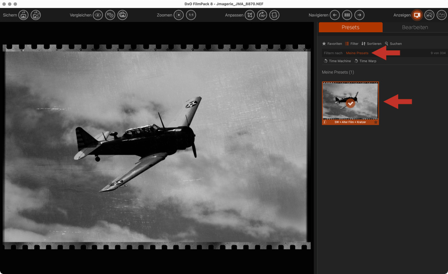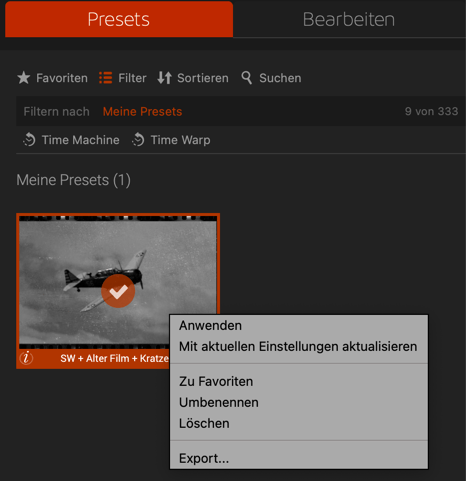 - Ihr eigenes Preset erscheint nun in der Preset-Palette und Sie können es einfach durch Auswahl des Menüpunkts Meine Presets im Filtermenü aufrufen.