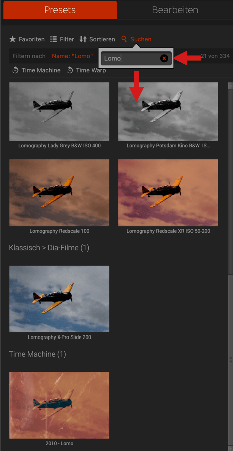 Sowohl eigene Presets als auch Favoriten können gesucht werden und auf die gleiche Weise gefiltert werden, wie Presets, die mit der Software ausgeliefert wurden.