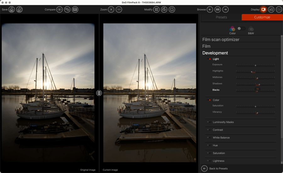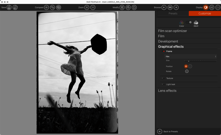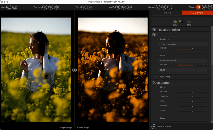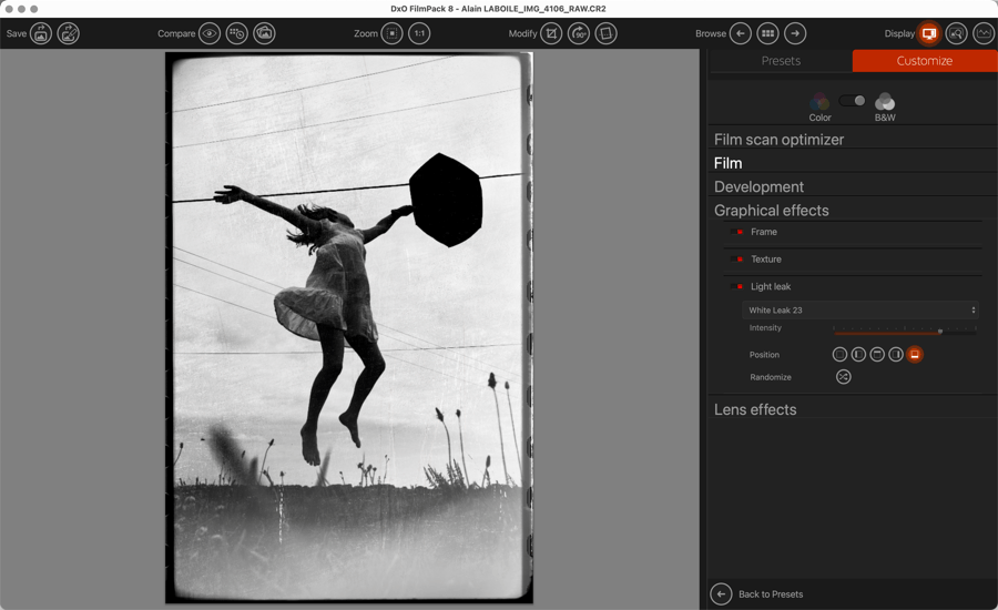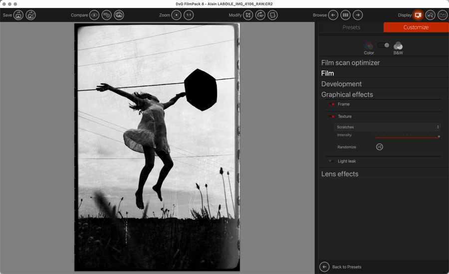 The Customize tab in DxO FilmPack contains all of the image correction and processing tools, both in color and black and white, plus a handful of tools for scanned films. It also complements the use of presets and different image renderings offered by the program, which you can modify to your liking here.