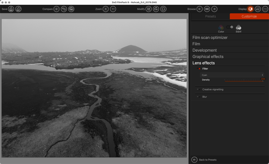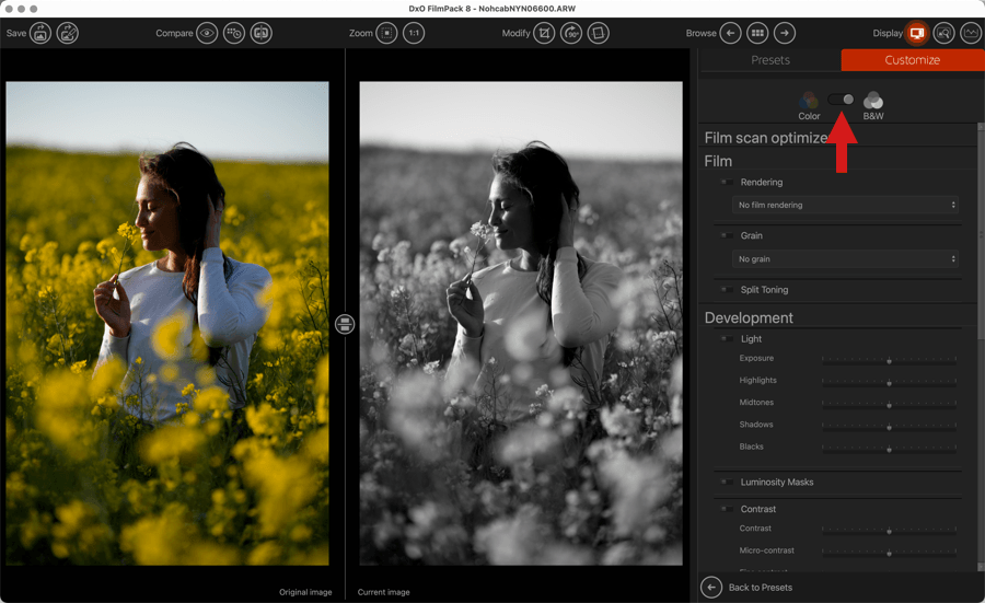 - If you have previously applied a preset, the switch will be set to the corresponding mode: if you apply a black & white preset and you move to the Customize tab, the switch will be on B&W.