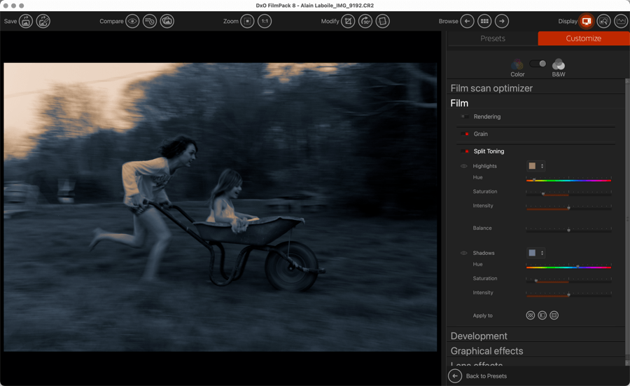 Unlike the Presets panel in which you click on a thumbnail to apply all of the characteristics of a particular film rendering, the Customize tab lets you apply the film rendering and grain characteristics separately.
