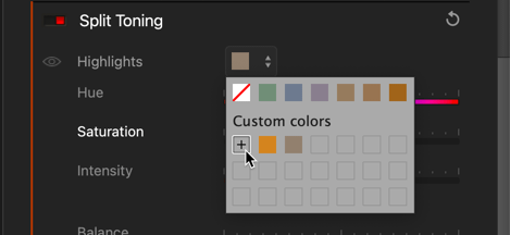 The palette for both light and dark tones also allows you to store custom hues. To do this, first make your adjustments with the Hue, Saturation and Intensity sliders and then click on the + button in the palette to add your hue.