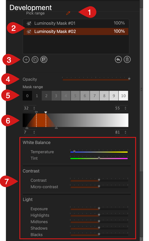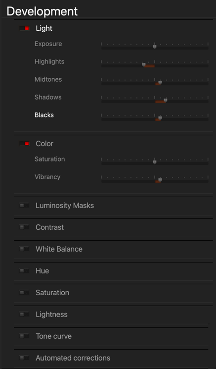 The Development tools allows you to make both basic corrections, such as brightness, contrast, white balance, and color, as well as very precise corrections, according to brightness ranges. It also contains the correction tools that are automatically applied when opening RAW files.