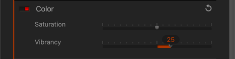 - Vibrancy: Compared to the Saturation slider described above, which affects all colors at once, the Vibrancy slider works in a more subtle manner by taking into account the different colors present in the image. Moving the slider to the right protects flesh tones and reinforces and deepens the blue of the sky without changing the tones that are close to gray, thus avoiding white balance drift. Moving toward the left diminishes the global saturation without going all the way to black and white; the desaturation is more pronounced among the reds, giving a more natural aspect to flesh tones. The range of this setting goes from –100 to 100.