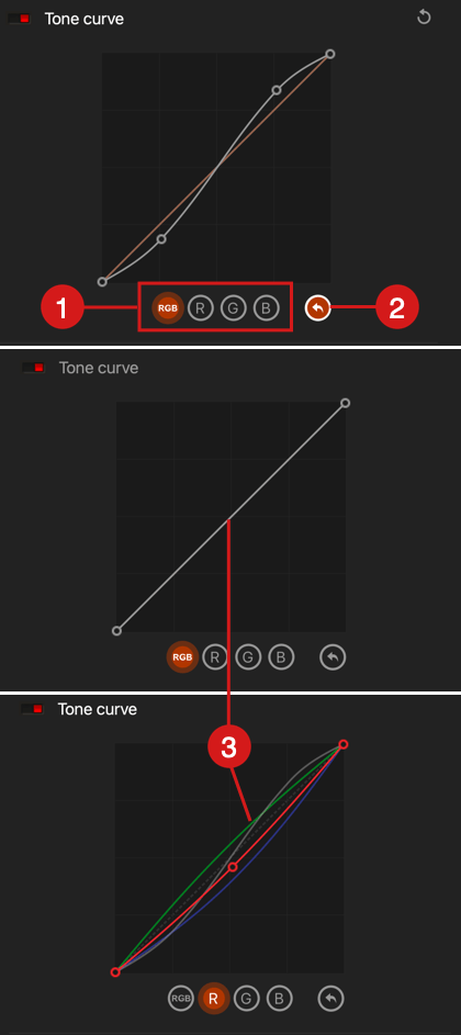 - R, G, B Curves: affect their respective color ranges and complementary colors (based on the color wheel principle), allowing you to correct or even introduce color casts:
