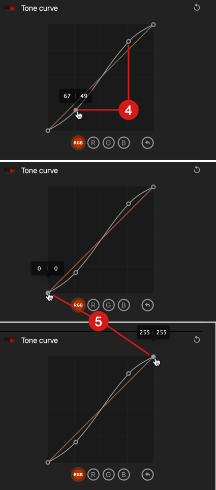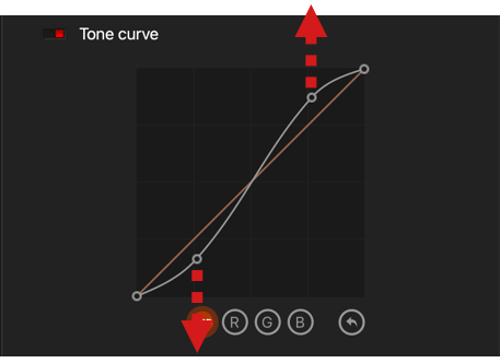 - R, G, B: Depending on your selection, the curve affects the red, green, or blue channel.