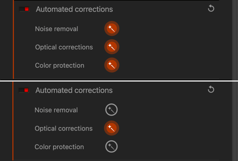 These corrections are displayed as buttons in the Automated corrections palette, and are displayed depending on the type of file and the automatic correction support offered by DxO FilmPack. You can deactivate/reactivate an automatic correction by clicking on the relevant button.