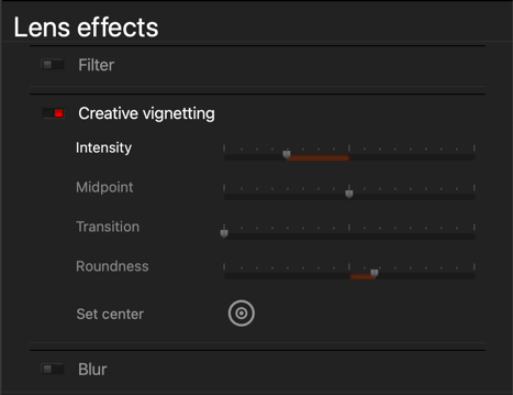 - Set center: lets you place the vignetting effect around the principal subject, regardless of the subject’s position in the image.