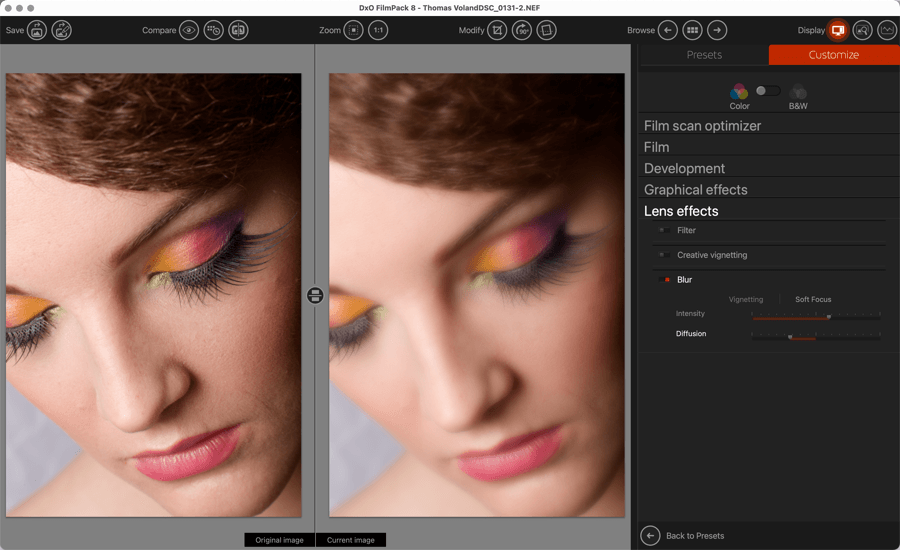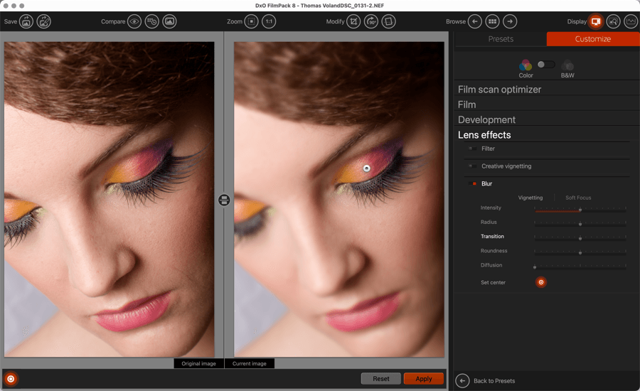 DxO FilmPack lets you de-center the effect so as to adapt it to the position of the subject in the image.