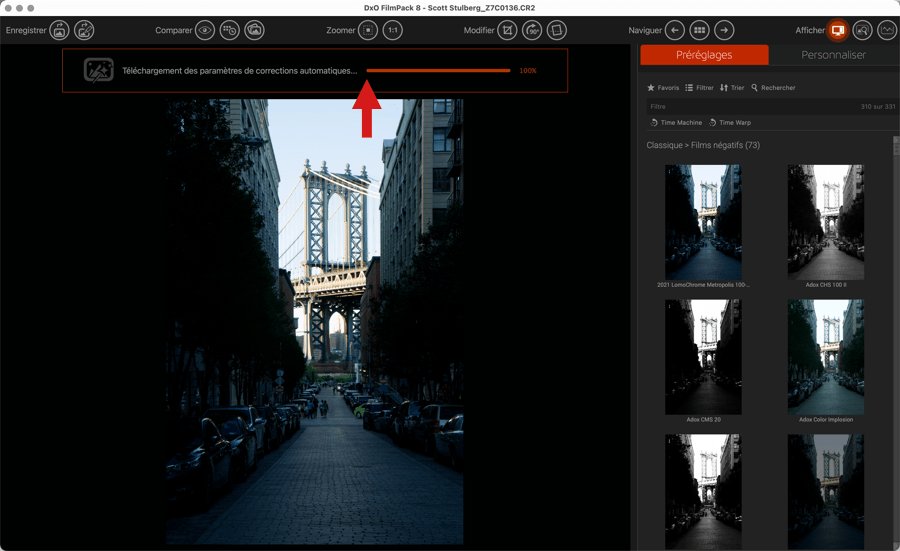 - Dès ouverture de l’image dans DxO FilmPack, un bandeau s’affiche au-dessus de l’image, indiquant le téléchargement des paramètres automatiques de correction.