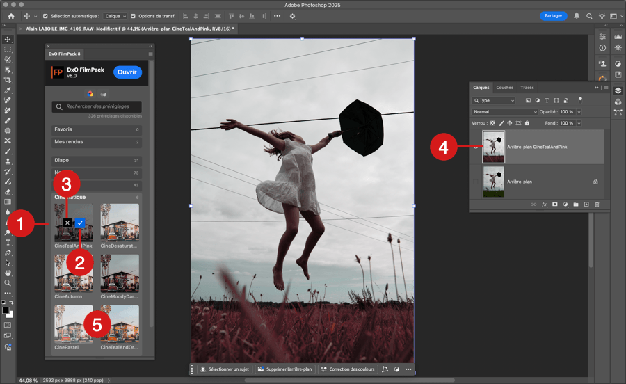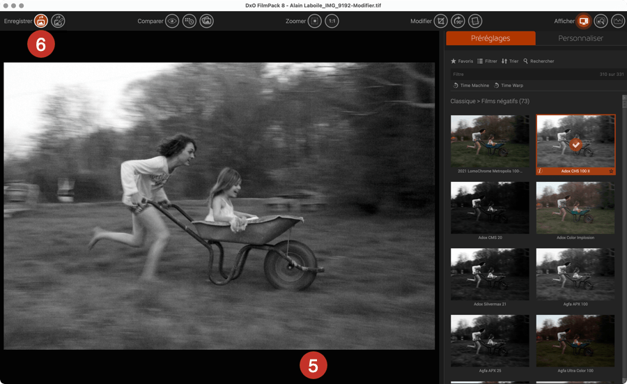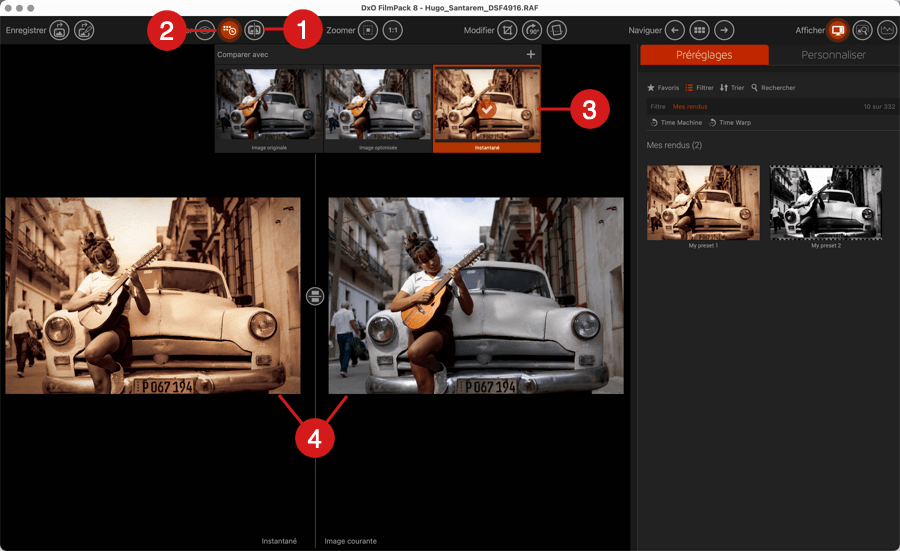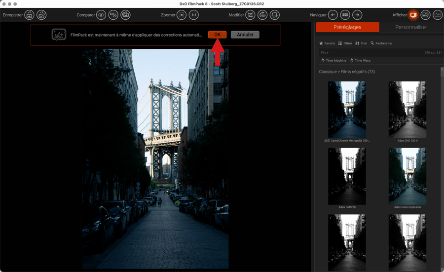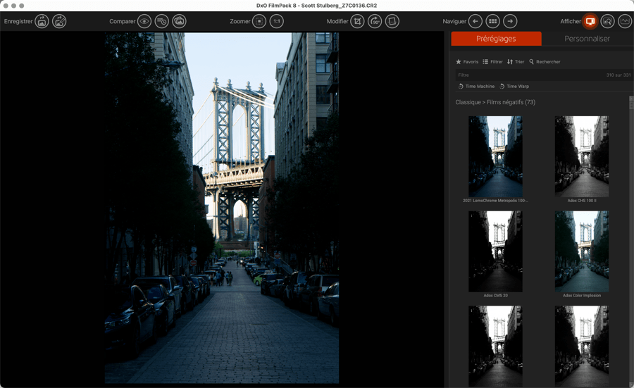 - Vous pouvez appliquer un autre préréglage avec la palette DxO FilmPack.