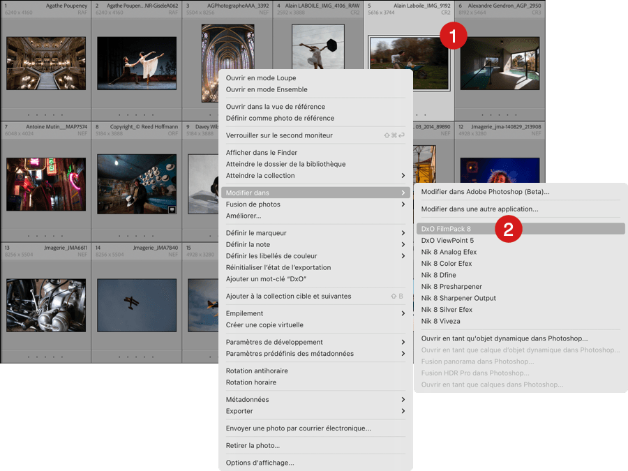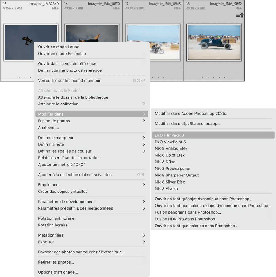 - Lancez l’application DxO FilmPack à partir du menu Photo > Modifier dans > Modifier dans DxO FilmPack.