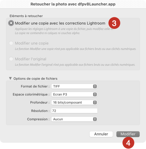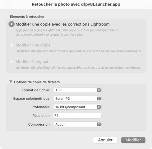 - Si vos options de fichiers ont déjà été définies dans les préférences de Lightroom Classic, cliquez directement sur Modifier (cependant, la fenêtre vous permet de modifier vos options d’édition externe à la volée).