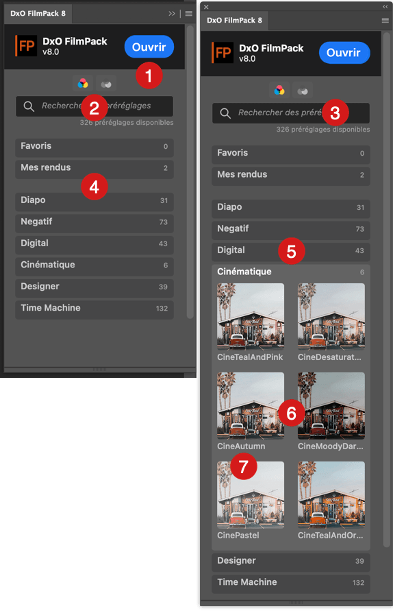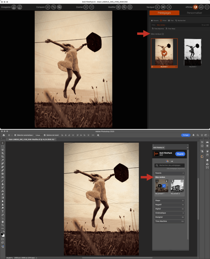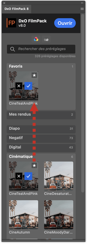 Les préréglages marqués comme favoris dans la palette Photoshop sont également visibles dans DxO FilmPack, et vice versa.