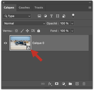 - Votre image est convertie en objet dynamique, comme l’indique le pictogramme dans le coin en bas à droite de la vignette du panneau Calques.