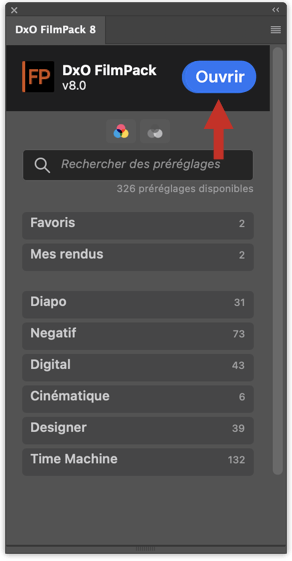 - À cette étape, vous pouvez appliquer directement un préréglage avec la palette DxO FilmPack, ou ouvrir la version autonome en cliquant sur Ouvrir dans la palette :