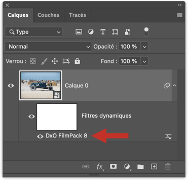 - Dans les deux scénarios, le panneau Calques affiche, sous le calque 0 ou d’arrière-plan (image originale), un filtre dynamique nommé DxO FilmPack.