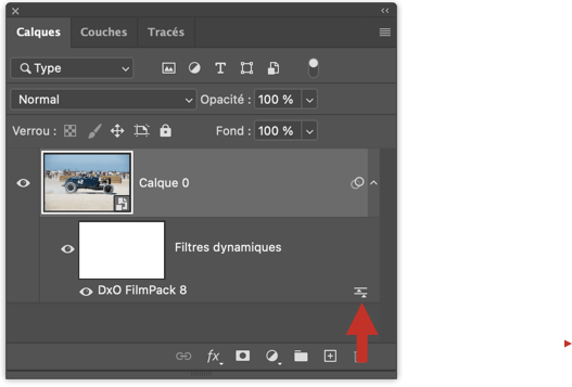 - Dans le panneau Calques, double-cliquez sur l’icône, tout à droite de la ligne du nom du filtre dynamique DxO FilmPack.