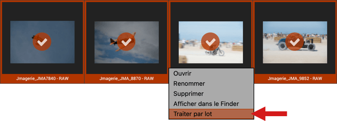 - Dans la Liste d’images, sélectionnez les images que vous souhaitez traiter par lots puis faites un clic-droit et sélectionnez Traiter par lot dans le menu flottant, ou allez dans le menu Fichier > Traitement par lots (Mac) ou dans le bouton Menu > Ouvrir un fichier > Traitement par lots (Windows).