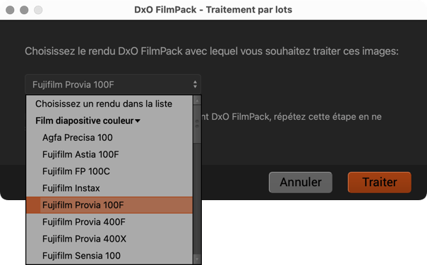 Le traitement par lots permet d’appliquer simultanément le même jeu de réglages d’un rendu à plusieurs photos. Il se gère de façon différente selon que vous utilisez DxO FilmPack en tant qu’application indépendante ou en module externe.