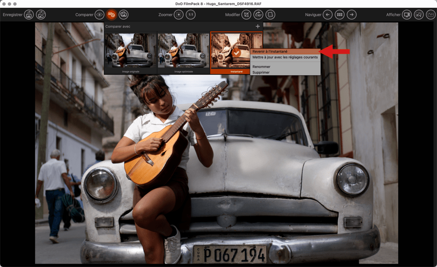 DxO FilmPack permet de prendre un instantané d’une image à une étape de son traitement. Cette fonction vous permet de mémoriser les différentes étapes de votre traitement de manière visuelle et de comparer les différents états entre eux. Il est possible de réappliquer un instantané à n’importe quel stade du traitement de l’image.