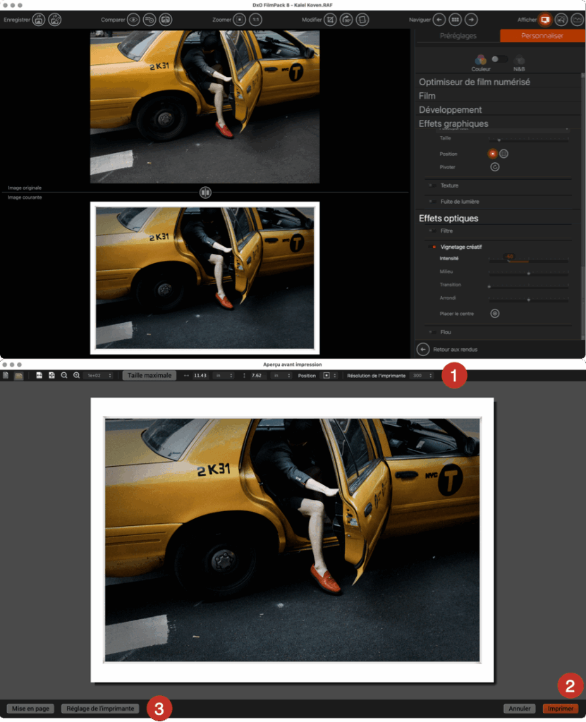 DxO FilmPack vous permet d’imprimer directement les photos, que ce soit la version indépendante ou la version module externe. Pour ouvrir la fenêtre d’impression, vous disposez de trois possibilités :