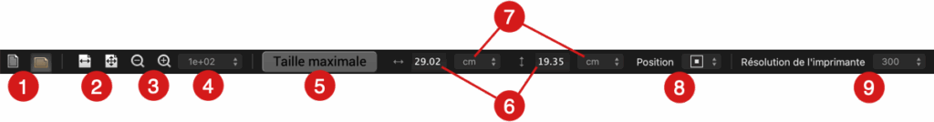 - Barre de commandes supérieure : outils de réglage d’orientation, de taille, de position et de résolution.