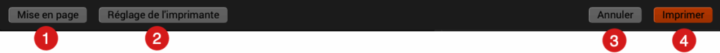 - Barre de commandes inférieure : réglages de mise en page, accès aux réglages de l’imprimante, boutons d’impression et d’annulation.