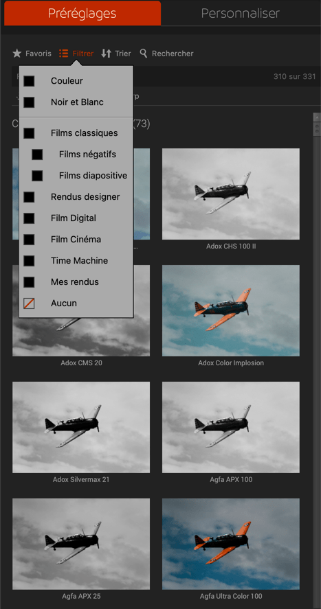 L’onglet Préréglages contient tous les préréglages et les catégories de préréglages proposés par DxO FilmPack. Ces préréglages sont présentés sous forme de vignettes générées à partir de l’image ouverte dans le programme. Ils vous permettent de visualiser, filtrer, appliquer et même créer vos propres préréglages, que ce soit à partir d’un préréglage existant, ou entièrement créés par vous-même, notamment grâce aux outils de correction couleur ou noir et blanc disponibles dans l’onglet Personnaliser.