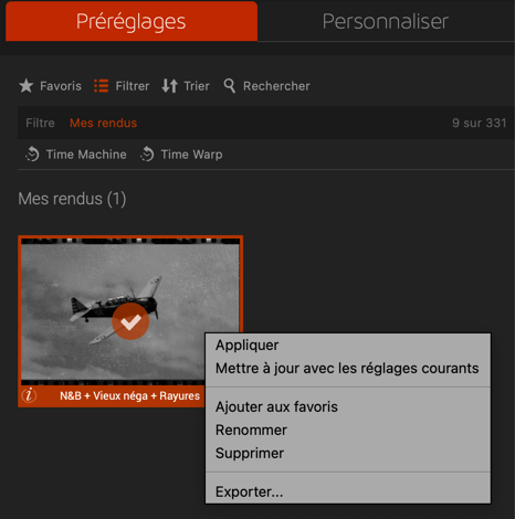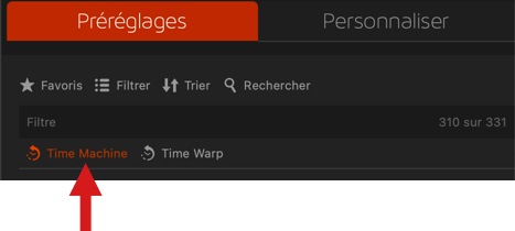 Après avoir quitté Time Machine et appliqué un préréglage, vous retrouverez le préréglage activé dans la liste, et indiqué par le cadre orange.