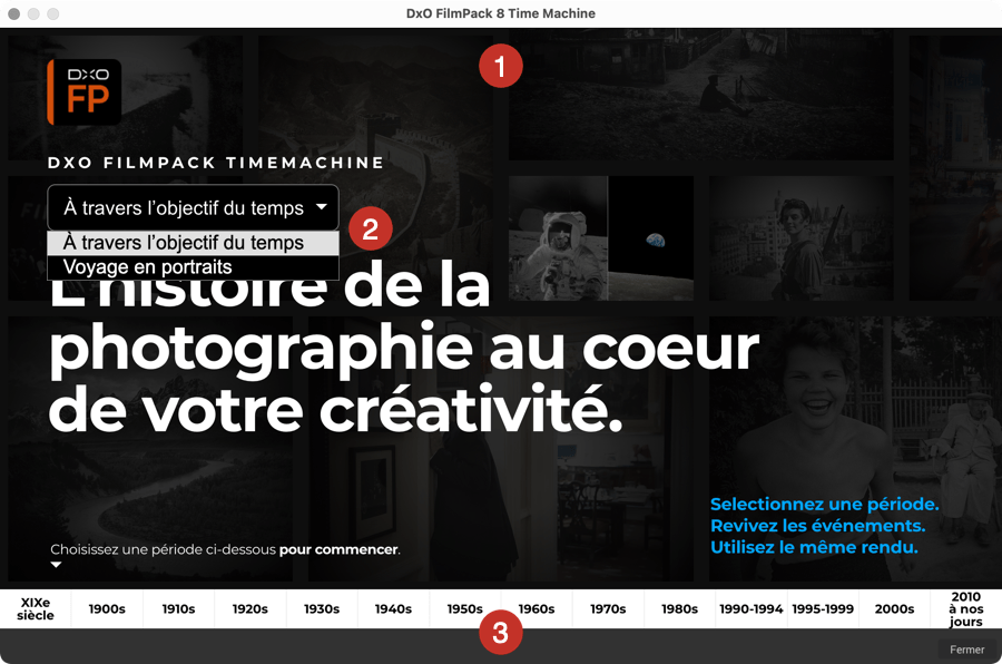 La fonctionnalité Time Machine vous permet de replacer des préréglages de films analogiques dans un contexte historique, pour une expérience de traitement d’image encore plus riche et divertissante. Vous pouvez y accéder en cliquant sur Time Machine, dans l’entête du panneau des contrôles (en mode d’affichage des rendus).