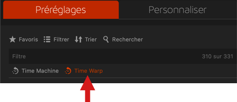 Time Warp est un moyen ludique et interactif d’appliquer des rendus à vos images. Après avoir cliqué sur Time Warp, dans l’en-tête du panneau Préréglages :