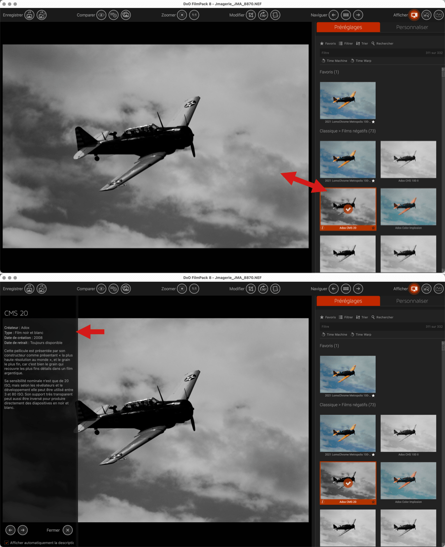 - Chaque exemple est accompagné de préréglages que vous pouvez appliquer à l’image couramment ouverte dans DxO FilmPack, tout simplement en cliquant dessus.