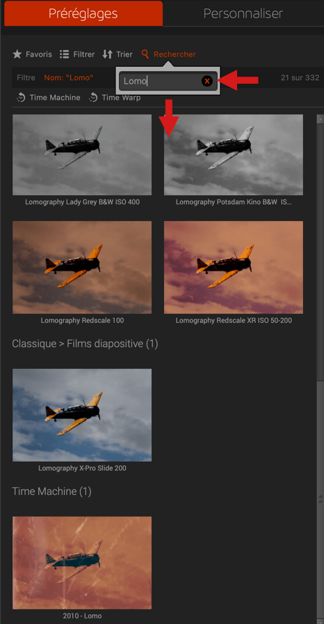- Nom du préréglage : Le nom dépend du type de préréglage, il peut s’agir d’un rendu particulier (Cappuccino) ou d’une pellicule (Kodak T-Max 100).