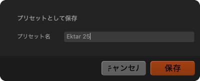 DxO FilmPack に付属するプリセットを上書きしたり削除したりすることはできません。 これらのプリセットに独自の変更を加えて保存したい場合は、新しいプリセットとして保存してください。