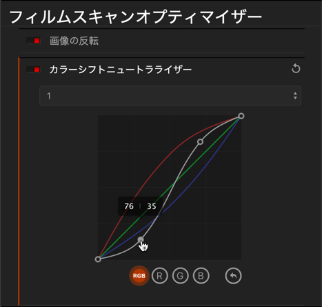 このカーブは、本章で後述するトーンカーブツールと同様に動作し、プリセットを微調整したり、独自のレンダリングを作成したりできます。 フィルムスキャンオプティマイザーはメインのトーンカーブから完全に独立していますが、組み合わせて使うことでさらに細かな調整が可能です。