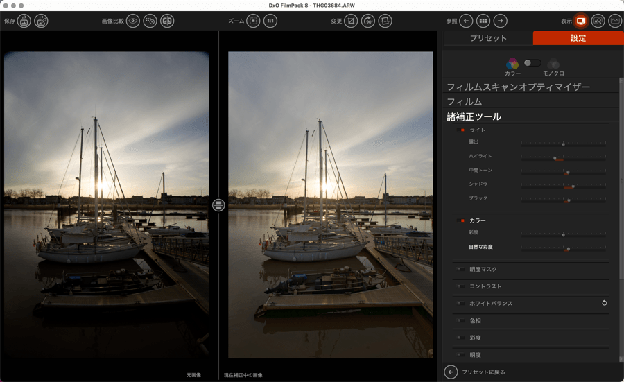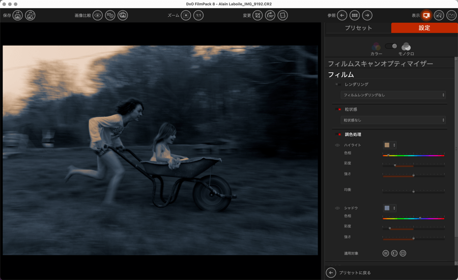 DxO FilmPack の「設定」タブには、カラーおよびモノクロの画像補正・処理ツール一式に加え、スキャンしたフィルム向けのツールも用意されています。 また、プログラムが提供するプリセットやさまざまな画像レンダリングの使用も補完しているため、ここで好みに合わせて変更できます。