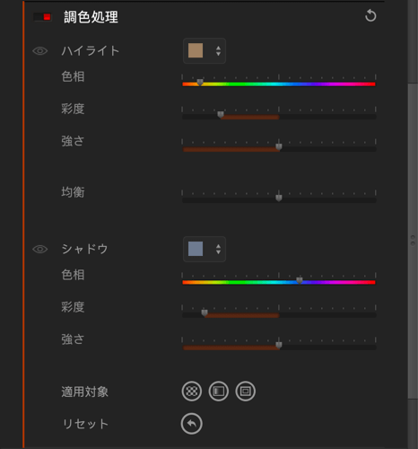 - 色相: 選択したトーニングの色を完全に、もしくはわずかに変更できます。