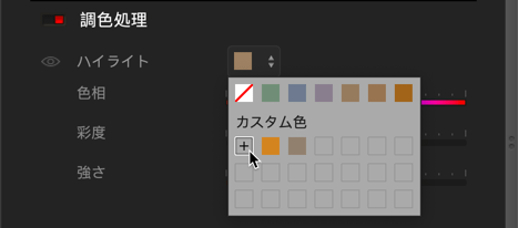 パレットでは、ハイライトでもシャドウでも、パーソナライズした色相を保存できます。 まず、[色相]、[彩度]、[強さ] のスライダを調整し、パレットの [+] ボタンをクリックして色相を追加します。