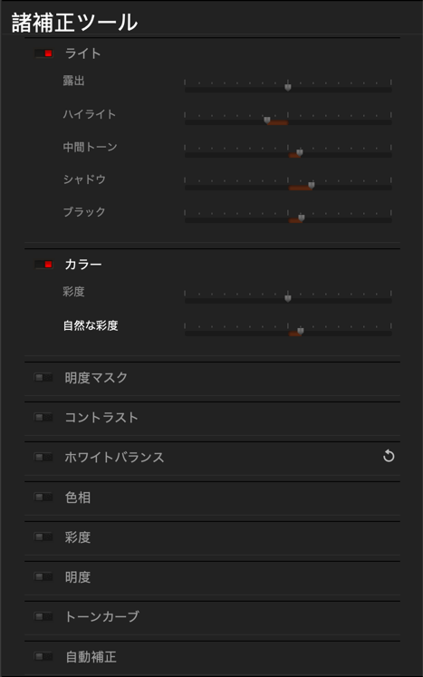 開発ツールを使用すると、明るさ、コントラスト、ホワイトバランス、色などの基本的な補正と、明るさの範囲に応じたきめ細かい補正の両方を行うことができます。 また、RAW ファイルを開くときに自動的に適用される補正ツールも含まれています。