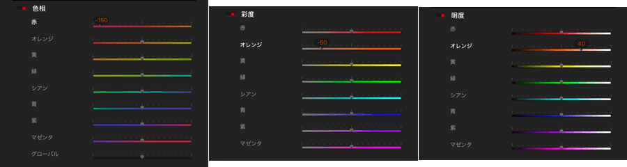 - 彩度: 選択した色相の鮮やかさを増加 (右) または減少 (左) します。
