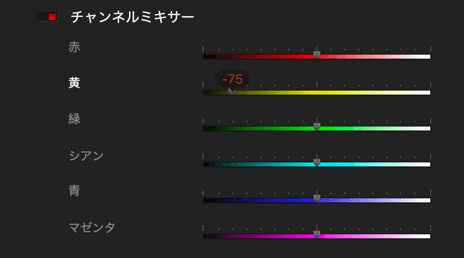 - R(赤):赤方向(上)またはシアン・青方向(下)にシフトします。