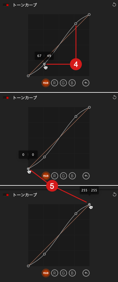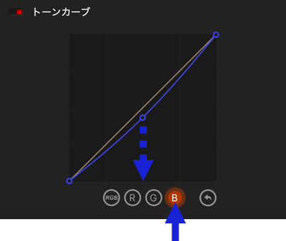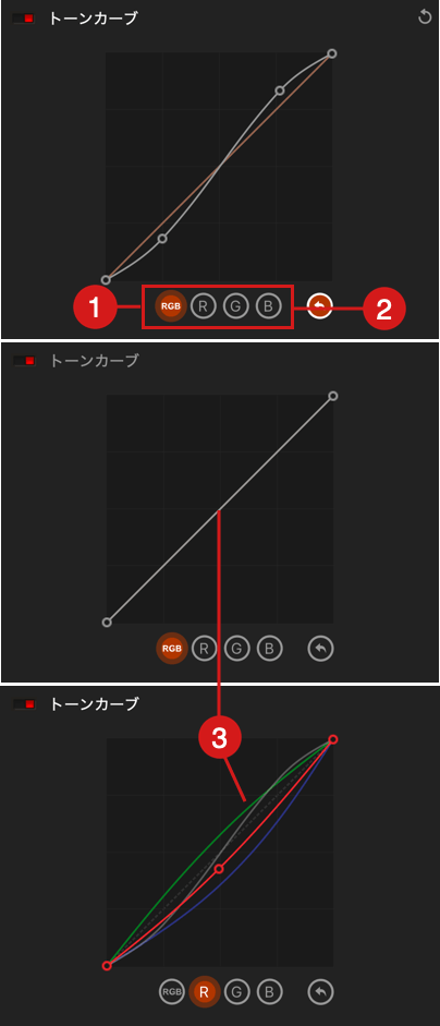 - R、G、B:選択に応じて、赤、緑、または青のチャンネルに影響するカーブ。