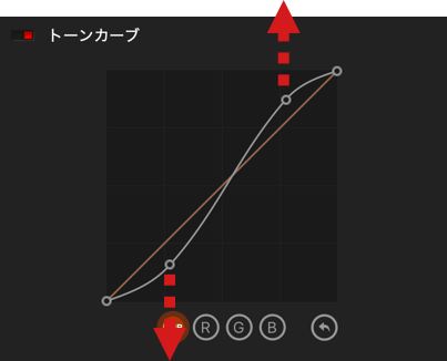 トーンカーブをマウスでクリックし動かすことで、画像の限定した部分の補正ができます。